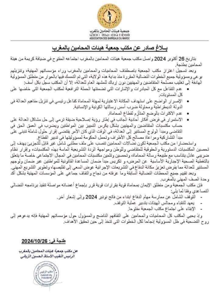 قررت جمعية هيئات المحامين بالمغرب التي انعقدت يوم السبت 26 أكتوبر 2024 بطنجة، إعلان المقاطعة الشاملة للجلسات المدنية والجنائية والتجارية والإدارية والإجراءات بجميع أنواعها والصناديق، ابتداء من 1 نونبر 2024 بشكل مفتوح إلى غاية تحقيق المطالب، مستثنين في ذلك ما ارتبط بآجال، إضافة إلى تنظيم وقفات أسبوعية لمدة ساعة كل يوم خميس بمختلف محاكم المملكة احتجاجاً على ”عدم اكتراث الحكومة للوضع، وعدم سعيها الجدي لإيجاد الحلول المناسبة”، مشيرين إلى أن اتخاذهم قرار العودة للاحتجاج ومقاطعة الجلسات هو “نتيجة حتمية للحوار المبتور وغير المنتج، معلنين في ذات الوقت تمسكهم بالمسار التصاعدي النضالي دفاعاً عن المحاماة وقيم العدالة.