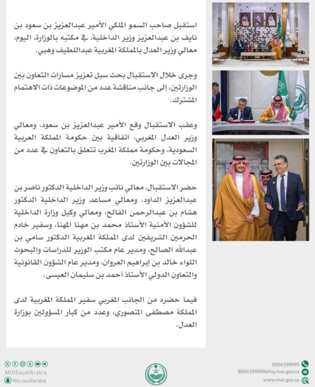 قع وزير العدل عبد اللطيف وهبي ووزير الداخلية السعودي عبد العزيز بن سعود بن نايف آل سعود، يوم الأربعاء بالرياض، على ثلاث اتفاقيات لتعزيز التعاون في المجال الجنائي بين البلدين.