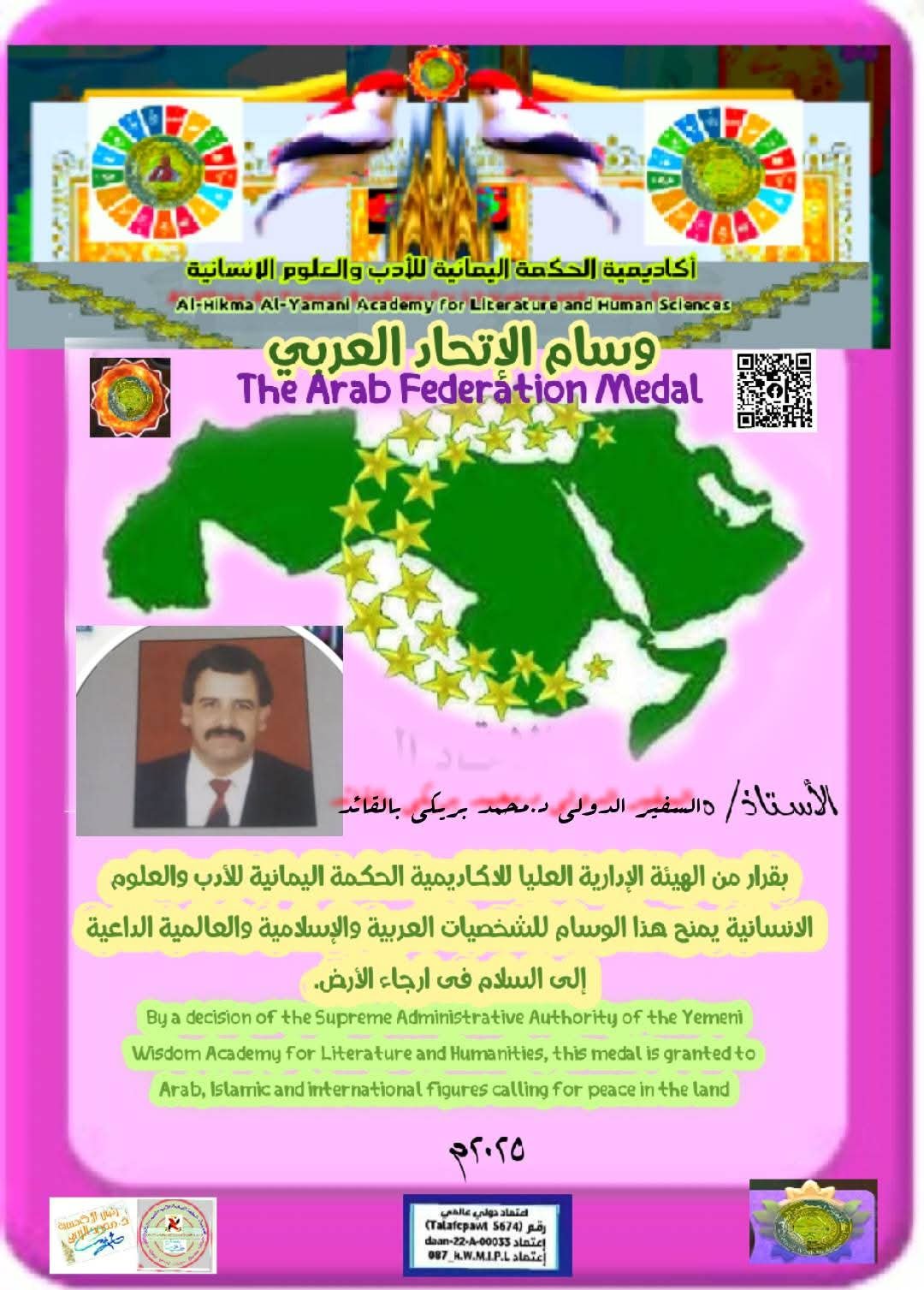 منحت اكاديمية الحكمة اليمانية للأدب و العلوم الإنسانية وسام الإتحاد العربي و ذلك بقرار من الهيئة الإدارية العليا للاتحاد جمعية الحكمة اليمانية للأدب و العلوم الإنسانية و سام الاستحقاق للشخصيات العربية و الإسلامية الداعية إلى السلام عبر أرجاء العالم. و جدير بالذكر أن الأديب محمد بريكي بلقايد سبق و ان نال عدة جوائز و شهادات تقديرية و أوسمة من هيئات عربية تعنى بشؤون الثقافة و الأدب و الشعر و الإبداع