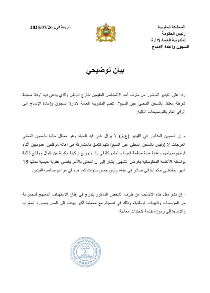 فندت المندوبية العامة لإدارة السجون وإعادة الإدماج المزاعم التي نشرها اليوتيوبر المغربي هشام جيراندو حول « وفاة ضابط شرطة معتقل » داخل المؤسسات السجنية المغربية. البلاغ الرسمي للمندوبية وصف هذه الادعاءات بـ »الأكاذيب الصارخة » و »المعلومات المغلوطة » التي لا أساس لها من الصحة.
