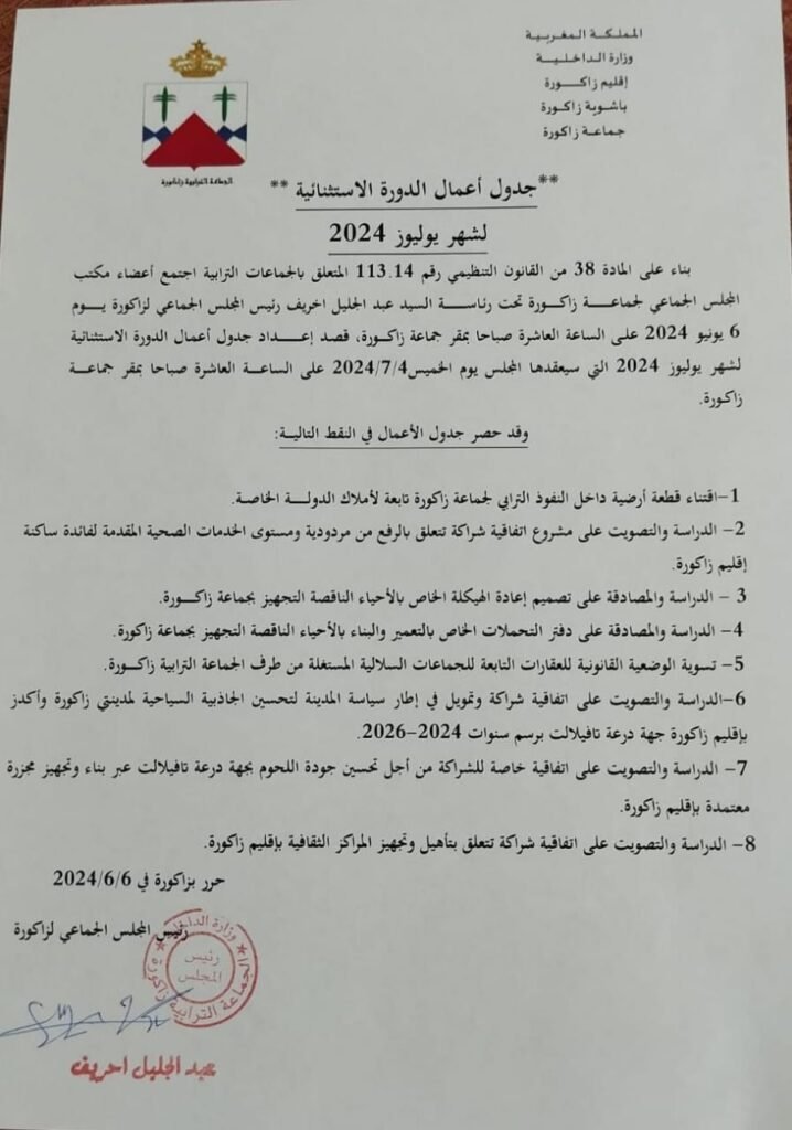 عقد مجلس جهة درعة تافيلالت، يوم الاثنين 01 يوليوز 2024، بمدينة تنغير، دورته العادية لشهر يوليوز 2024، و التي ترأسها رئيس مجلس جهة درعة تافيلالت السيد اهرو أبرو، بحضور السيد والي جهة درعة- تافيلالت، بوشعاب يحضيه، و السادة عمال أقاليم ميدلت و تنغير و زاكورة، و السيدات و السادة أعضاء مجلس جهة درعة تافيلالت و بعض رؤساء المصالح اللاممركزة للدولة بالجهة، حيث تدارس المجلس عدة مشاريع و اتفاقيات تهدف إلى تعزيز الشبكة الطرقية وفك العزلة و إنعاش السياحة و تأهيل المدن و المراكز و تحسين جاذبيتها و جماليتها و تقوية الشبكة المائية و حماية البيئة و التطهير السائل، فضلا عن مشاريع تندرج في مجالات التكوين المستمر للمنتخبين، و الثقافة و الصحة والحماية الإجتماعية.